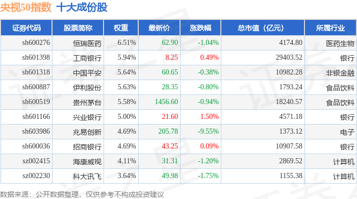 证券之星消息,11月14日,央视50(399550)指数报收于8059.92点,跌1.13%,成交593.48亿元,换手率0.34%。当日该指数成份股中,上涨的有12家,双鹭药业以2.15%的涨幅领涨,下跌的有38家,兆易创新以9.55%的跌幅领跌。