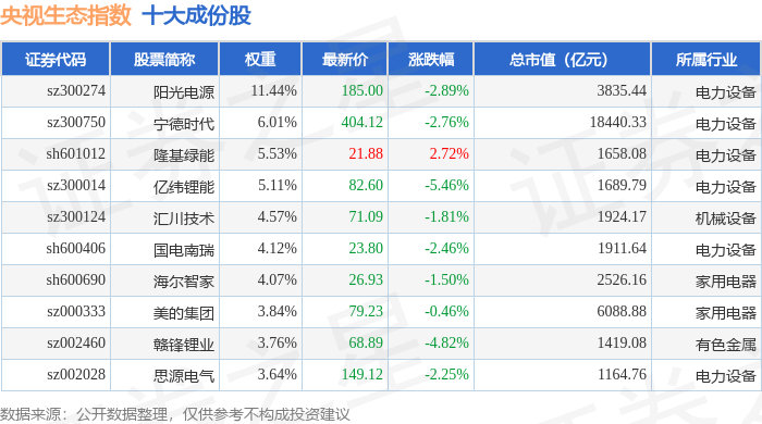 证券之星消息,11月14日,央视生态(399556)指数报收于3008.93点,跌1.69%,成交956.89亿元,换手率1.09%。当日该指数成份股中,上涨的有10家,贵研铂业以7.53%的涨幅领涨,下跌的有35家,亿纬锂能以5.46%的跌幅领跌。
