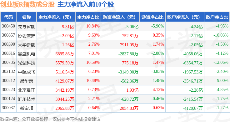 资金流向方面,创业板R(399606)指数成份股当日主力资金净流出合计118.45亿元,游资资金净流入合计57.7亿元,散户资金净流入合计60.74亿元。成份股资金流向详情见下表: