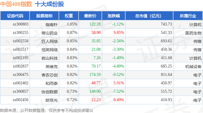 证券之星消息,11月14日,中创400(399624)指数报收于2485.91点,跌1.66%,成交2467.43亿元,换手率2.82%。当日该指数成份股中,上涨的有78家,众生药业以9.98%的涨幅领涨,下跌的有314家,香农芯创以9.52%的跌幅领跌。