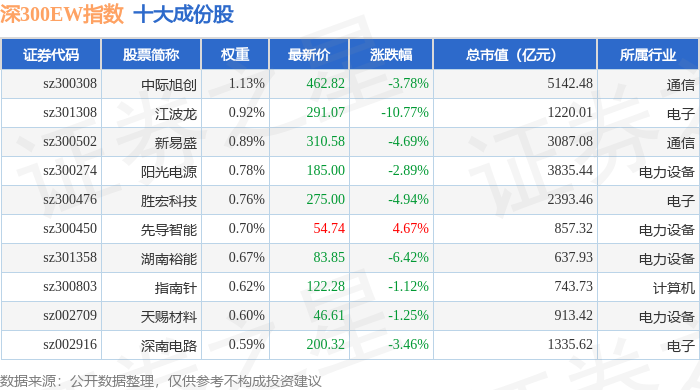 证券之星消息,11月14日,深300EW(399633)指数报收于6117.22点,跌1.84%,成交3448.88亿元,换手率1.37%。当日该指数成份股中,上涨的有40家,电投产融以9.94%的涨幅领涨,下跌的有253家,江波龙以10.77%的跌幅领跌。
