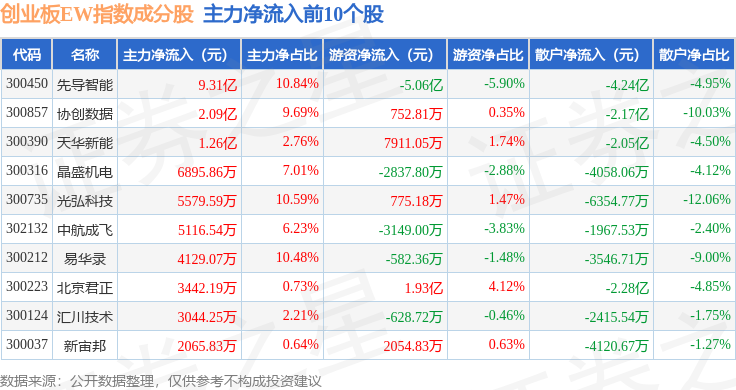 资金流向方面,创业板EW(399635)指数成份股当日主力资金净流出合计118.45亿元,游资资金净流入合计57.7亿元,散户资金净流入合计60.74亿元。成份股资金流向详情见下表:
