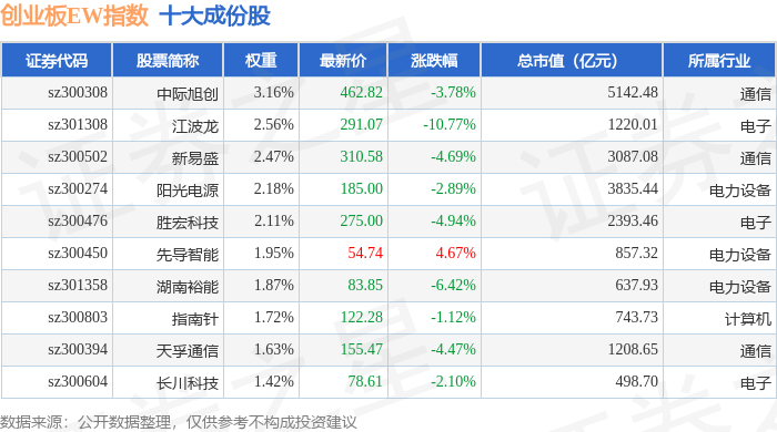 证券之星消息,11月14日,创业板EW(399635)指数报收于2091.3点,跌2.57%,成交1597.87亿元,换手率2.41%。当日该指数成份股中,上涨的有7家,先导智能以4.67%的涨幅领涨,下跌的有92家,江波龙以10.77%的跌幅领跌。