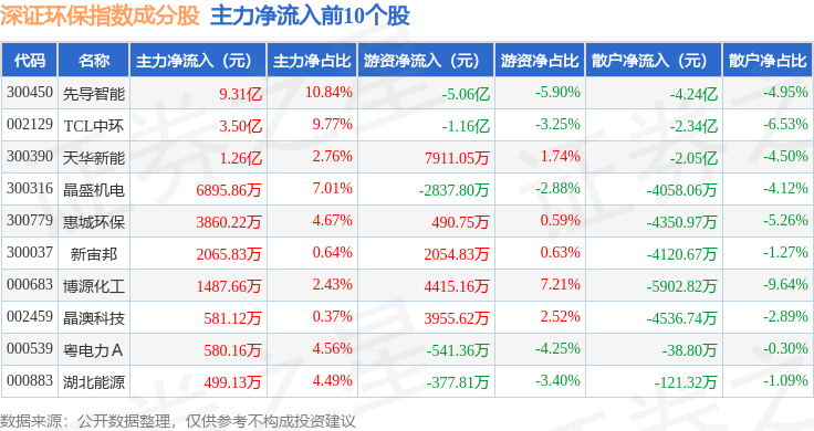 资金流向方面,深证环保(399638)指数成份股当日主力资金净流出合计48.92亿元,游资资金净流入合计28.1亿元,散户资金净流入合计20.82亿元。成份股资金流向详情见下表: