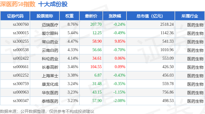 深医药50(399647)指数十大成份股详情如下:
