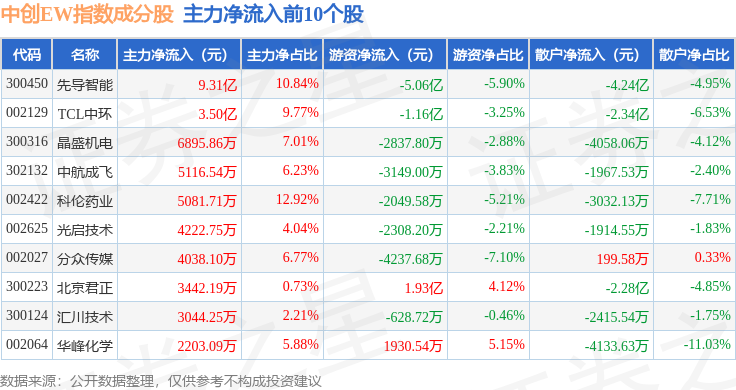 资金流向方面,中创EW(399660)指数成份股当日主力资金净流出合计157.9亿元,游资资金净流入合计69.36亿元,散户资金净流入合计88.54亿元。成份股资金流向详情见下表: