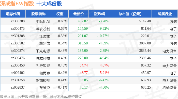 证券之星消息,11月14日,深成指EW(399659)指数报收于4649.83点,跌1.53%,成交4860.57亿元,换手率1.81%。当日该指数成份股中,上涨的有98家,航天发展以10.06%的涨幅领涨,下跌的有390家,江波龙以10.77%的跌幅领跌。