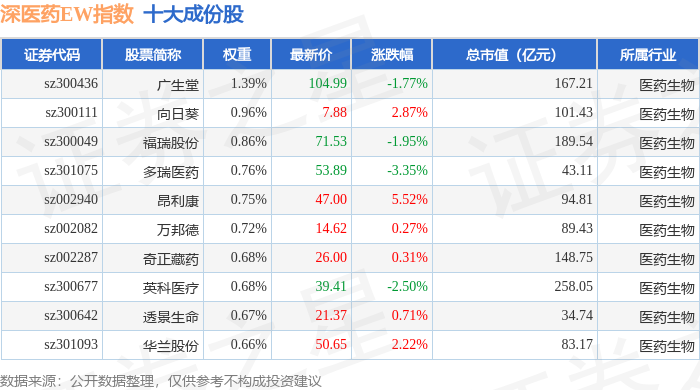 证券之星消息,11月14日,深医药EW(399676)指数报收于4099.7点,涨1.1%,成交774.13亿元,换手率3.44%。当日该指数成份股中,上涨的有127家,漱玉平民以20.03%的涨幅领涨,下跌的有85家,宏源药业以7.05%的跌幅领跌。