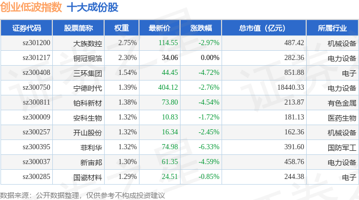 证券之星消息,11月14日,创业低波(399692)指数报收于3989.7点,跌1.14%,成交492.7亿元,换手率1.82%。当日该指数成份股中,上涨的有18家,华兰疫苗以7.22%的涨幅领涨,下跌的有78家,菲利华以6.33%的跌幅领跌。