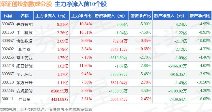 资金流向方面,深证创投(399696)指数成份股当日主力资金净流出合计70.1亿元,游资资金净流入合计29.98亿元,散户资金净流入合计40.12亿元。成份股资金流向详情见下表: