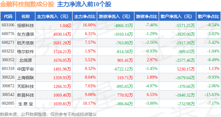 资金流向方面,金融科技(399699)指数成份股当日主力资金净流出合计30.02亿元,游资资金净流入合计8.15亿元,散户资金净流入合计21.87亿元。成份股资金流向详情见下表: