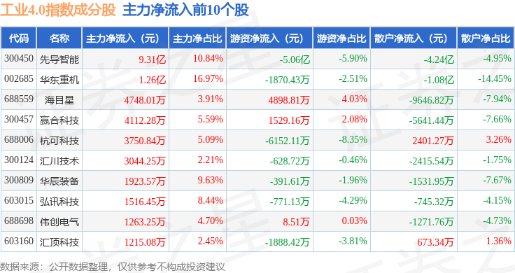 资金流向方面,工业4.0(399803)指数成份股当日主力资金净流出合计61.09亿元,游资资金净流入合计18.45亿元,散户资金净流入合计42.64亿元。成份股资金流向详情见下表: