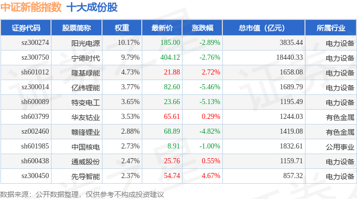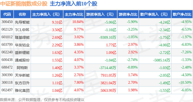 资金流向方面,中证新能(399808)指数成份股当日主力资金净流出合计52.0亿元,游资资金净流入合计37.06亿元,散户资金净流入合计14.94亿元。成份股资金流向详情见下表: