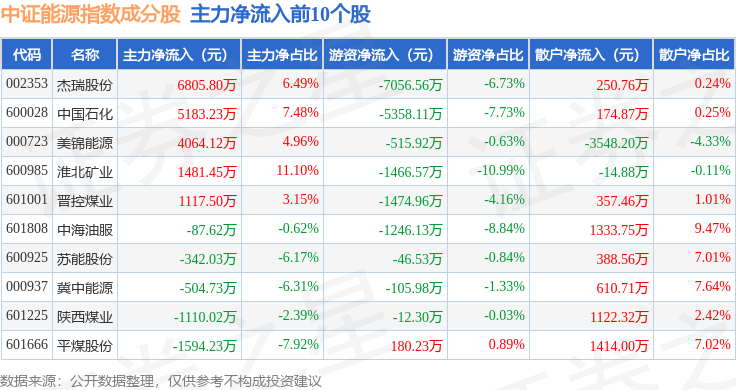 资金流向方面,中证能源(399928)指数成份股当日主力资金净流出合计6.32亿元,游资资金净流出合计5229.69万元,散户资金净流入合计6.85亿元。成份股资金流向详情见下表: