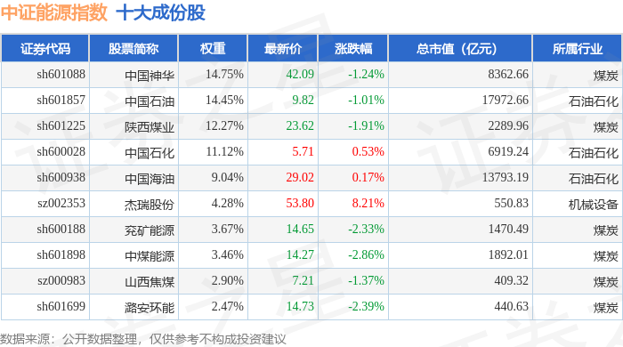 证券之星消息,11月14日,中证能源(399928)指数报收于3000.06点,跌0.72%,成交111.81亿元,换手率0.37%。当日该指数成份股中,上涨的有6家,杰瑞股份以8.21%的涨幅领涨,下跌的有17家,晋控煤业以3.46%的跌幅领跌。