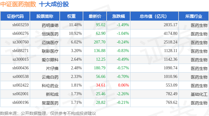 中证医药(399933)指数十大成份股详情如下: