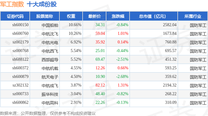资金流向方面,军工指数(399959)成份股当日主力资金净流出合计3.4亿元,游资资金净流入合计1.06亿元,散户资金净流入合计2.33亿元。成份股资金流向详情见下表: