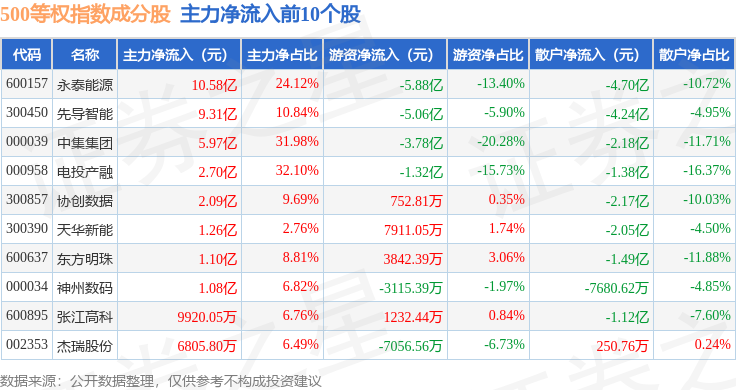 资金流向方面,500等权(399982)指数成份股当日主力资金净流出合计162.39亿元,游资资金净流入合计34.6亿元,散户资金净流入合计127.79亿元。成份股资金流向详情见下表: