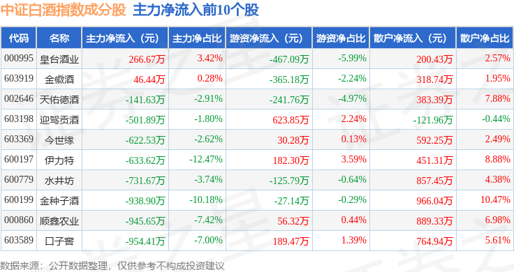 资金流向方面,中证白酒(399997)指数成份股当日主力资金净流出合计9.76亿元,游资资金净流入合计4.91亿元,散户资金净流入合计4.85亿元。成份股资金流向详情见下表: