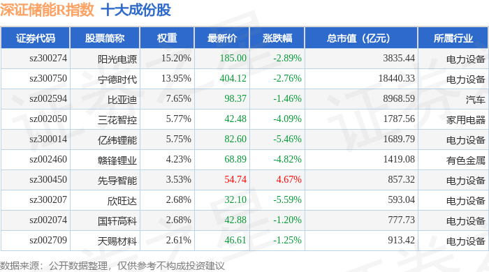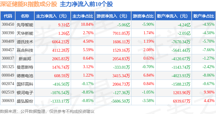资金流向方面,深证储能R(470036)指数成份股当日主力资金净流出合计81.32亿元,游资资金净流入合计32.91亿元,散户资金净流入合计48.41亿元。成份股资金流向详情见下表: