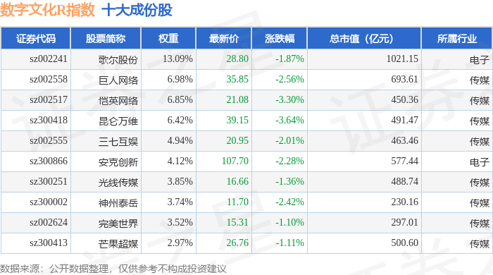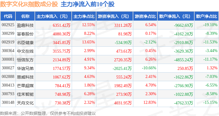 资金流向方面,数字文化R(470047)指数成份股当日主力资金净流出合计10.7亿元,游资资金净流入合计3.65亿元,散户资金净流入合计7.05亿元。成份股资金流向详情见下表: