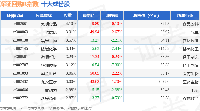 证券之星消息,11月14日,深证回购R(470063)指数报收于3262.56点,跌0.28%,成交167.11亿元,换手率1.42%。当日该指数成份股中,上涨的有18家,孚日股份以9.99%的涨幅领涨,下跌的有32家,华源控股以7.3%的跌幅领跌。