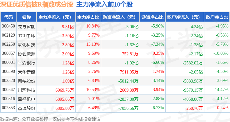 资金流向方面,深证优质信披R(470065)指数成份股当日主力资金净流出合计243.36亿元,游资资金净流入合计74.92亿元,散户资金净流入合计168.44亿元。成份股资金流向详情见下表: