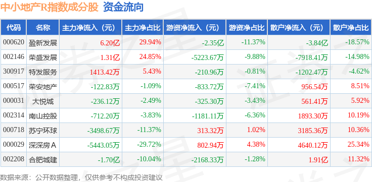 资金流向方面,中小地产R(471002)指数成份股当日主力资金净流入合计4.96亿元,游资资金净流出合计3.24亿元,散户资金净流出合计1.72亿元。成份股资金流向详情见下表:
