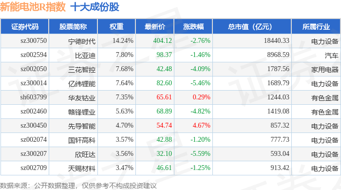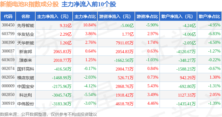 资金流向方面,新能电池R(480032)指数成份股当日主力资金净流出合计50.09亿元,游资资金净流入合计25.01亿元,散户资金净流入合计25.08亿元。成份股资金流向详情见下表:
