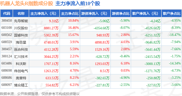 资金流向方面,机器人龙头R(480071)指数成份股当日主力资金净流出合计8.84亿元,游资资金净流出合计2.11亿元,散户资金净流入合计10.95亿元。成份股资金流向详情见下表: