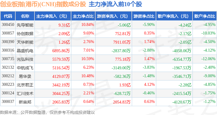 资金流向方面,创业板指(港币)(CNH)(970006)指数成份股当日主力资金净流出合计118.45亿元,游资资金净流入合计57.7亿元,散户资金净流入合计60.74亿元。成份股资金流向详情见下表:
