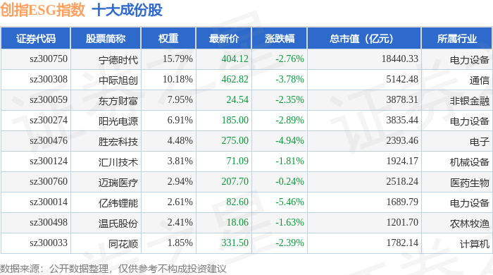 证券之星消息,11月14日,创指ESG(970028)指数报收于3237.91点,跌2.69%,成交1264.57亿元,换手率2.4%。当日该指数成份股中,上涨的有7家,先导智能以4.67%的涨幅领涨,下跌的有72家,协创数据以7.52%的跌幅领跌。