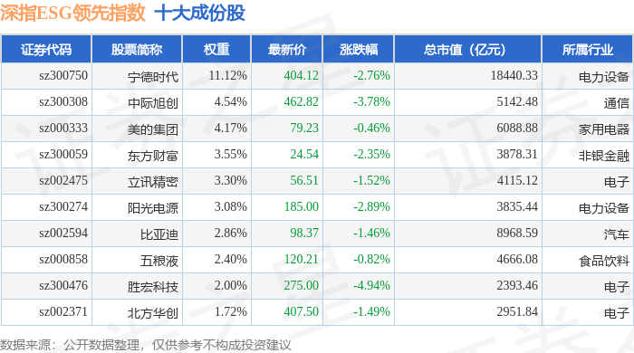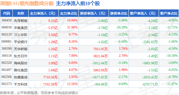 资金流向方面,深指ESG领先(970029)指数成份股当日主力资金净流出合计142.11亿元,游资资金净流入合计56.73亿元,散户资金净流入合计85.38亿元。成份股资金流向详情见下表: