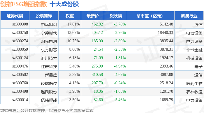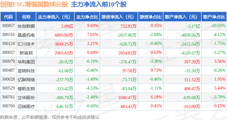 资金流向方面,创指ESG增强(970034)指数成份股当日主力资金净流出合计88.04亿元,游资资金净流入合计44.79亿元,散户资金净流入合计43.25亿元。成份股资金流向详情见下表: