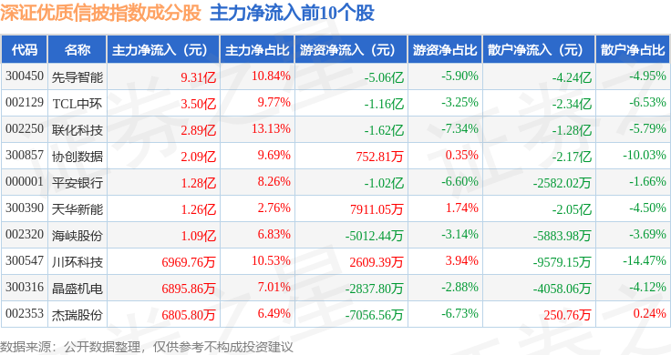 资金流向方面,深证优质信披(970065)指数成份股当日主力资金净流出合计243.36亿元,游资资金净流入合计74.92亿元,散户资金净流入合计168.44亿元。成份股资金流向详情见下表: