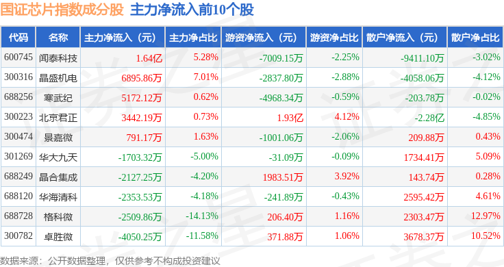 资金流向方面,国证芯片(980017)指数成份股当日主力资金净流出合计60.88亿元,游资资金净流入合计32.39亿元,散户资金净流入合计28.48亿元。成份股资金流向详情见下表: