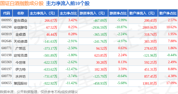 资金流向方面,国证白酒(980031)指数成份股当日主力资金净流出合计10.52亿元,游资资金净流入合计4.55亿元,散户资金净流入合计5.97亿元。成份股资金流向详情见下表: