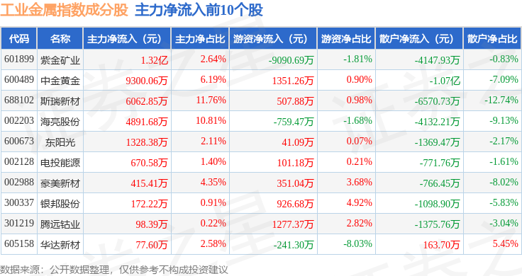 资金流向方面,工业金属(980043)指数成份股当日主力资金净流出合计35.87亿元,游资资金净流入合计10.52亿元,散户资金净流入合计25.35亿元。成份股资金流向详情见下表: