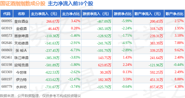 资金流向方面,国证酒指(980049)指数成份股当日主力资金净流出合计11.06亿元,游资资金净流入合计5.16亿元,散户资金净流入合计5.9亿元。成份股资金流向详情见下表: