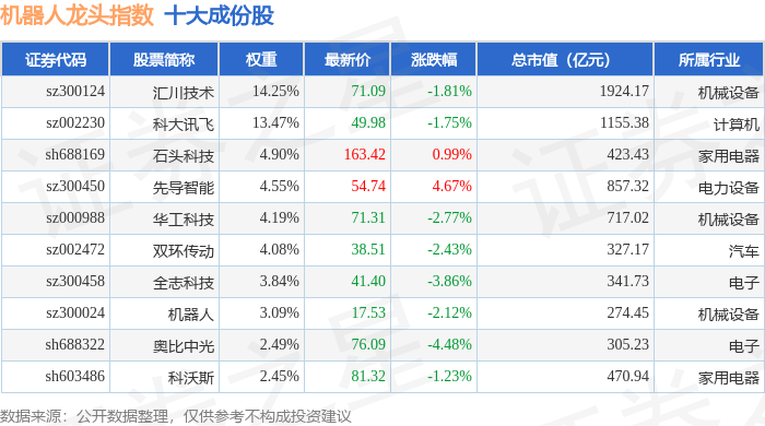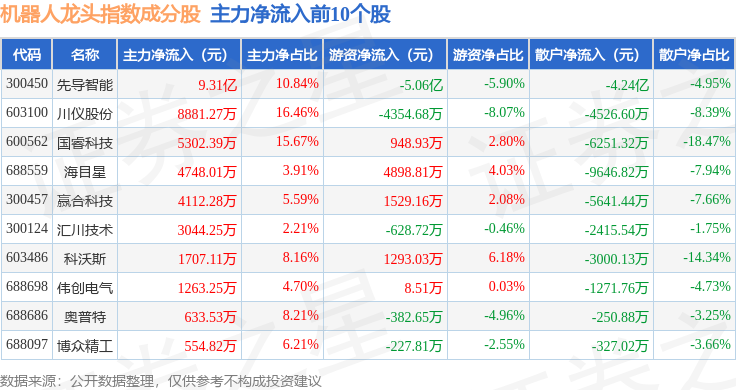 资金流向方面,机器人龙头(980071)指数成份股当日主力资金净流出合计8.84亿元,游资资金净流出合计2.11亿元,散户资金净流入合计10.95亿元。成份股资金流向详情见下表: