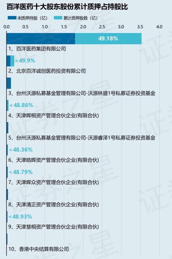 截止本公告日,股东百洋医药集团有限公司已累计质押股份1.74亿股,占其持股总数的49.18%,股东北京百洋诚创医药投资有限公司已累计质押股份998.0万股,占其持股总数的49.9%,股东天津晖桐资产管理合伙企业(有限合伙)已累计质押股份280.0万股,占其持股总数的48.86%,股东天津皓晖资产管理合伙企业(有限合伙)已累计质押股份210.0万股,占其持股总数的48.36%,股东天津晖众资产管理合伙企业(有限合伙)已累计质押股份210.0万股,占其持股总数的48.79%,股东天津慧桐资产管理合伙企业(有限合伙)已累计质押股份160.0万股,占其持股总数的48.93%。本次质押后百洋医药十大股东的累计质押股份占持股比例(占持股比例的计算以公司最新一期财务报表公布的十大股东的持股总数为基准)见下图: