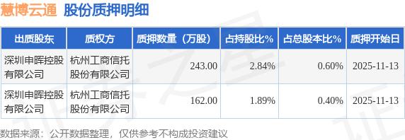 证券之星消息,慧博云通(301316)11月14日公开信息显示,股东深圳申晖控股有限公司向杭州工商信托股份有限公司合计质押405.0万股,占总股本1.0%。质押详情见下表:
