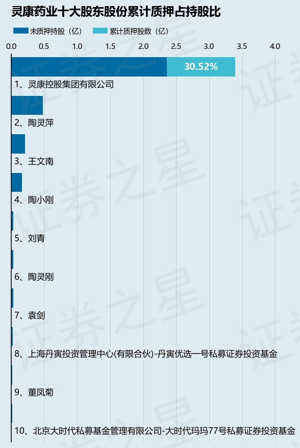 截止本公告日,股东灵康控股集团有限公司已累计质押股份1.04亿股,占其持股总数的30.52%。本次质押后灵康药业十大股东的累计质押股份占持股比例(占持股比例的计算以公司最新一期财务报表公布的十大股东的持股总数为基准)见下图: