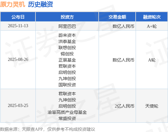 证券之星消息,根据天眼查APP于11月13日公布的信息整理,原力灵机(重庆)智能科技有限公司A+轮融资,融资额数亿人民币,参与投资的机构包括阿里巴巴。