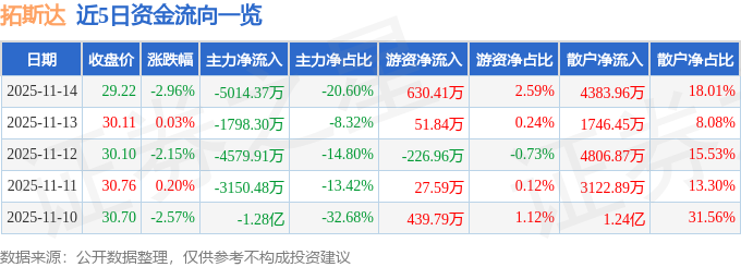 证券之星消息,截至2025年11月14日收盘,拓斯达(300607)报收于29.22元,下跌2.96%,换手率2.47%,成交量8.2万手,成交额2.43亿元。
