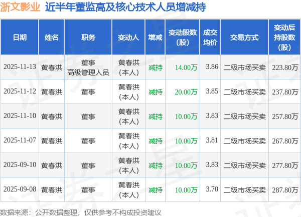 浙文影业近半年内的董监高及核心技术人员增减持详情如下: