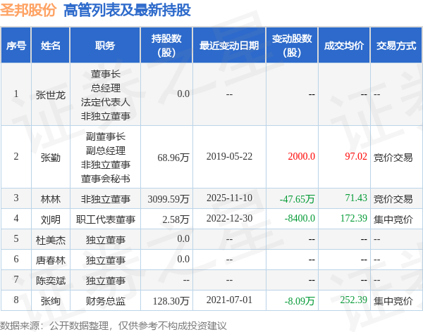 圣邦股份近半年内的董监高及核心技术人员增减持详情如下: