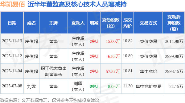 华凯易佰近半年内的董监高及核心技术人员增减持详情如下: