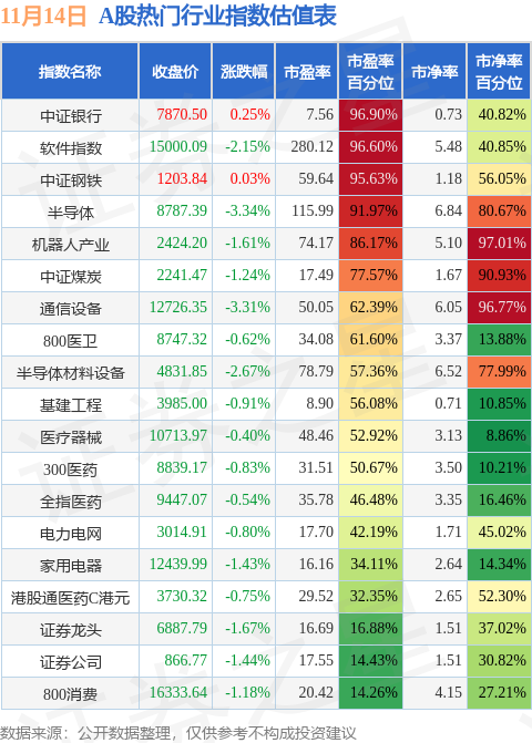 热门行业指数方面,中证银行的市盈率百分位较高,为96.9%。而800消费的市盈率百分位较低,为14.26%。