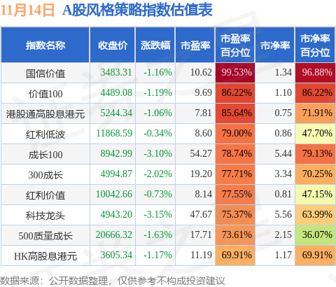 风格策略指数方面,国信价值的市盈率百分位较高,为99.53%。而HK高股息港元的市盈率百分位较低,为69.91%。